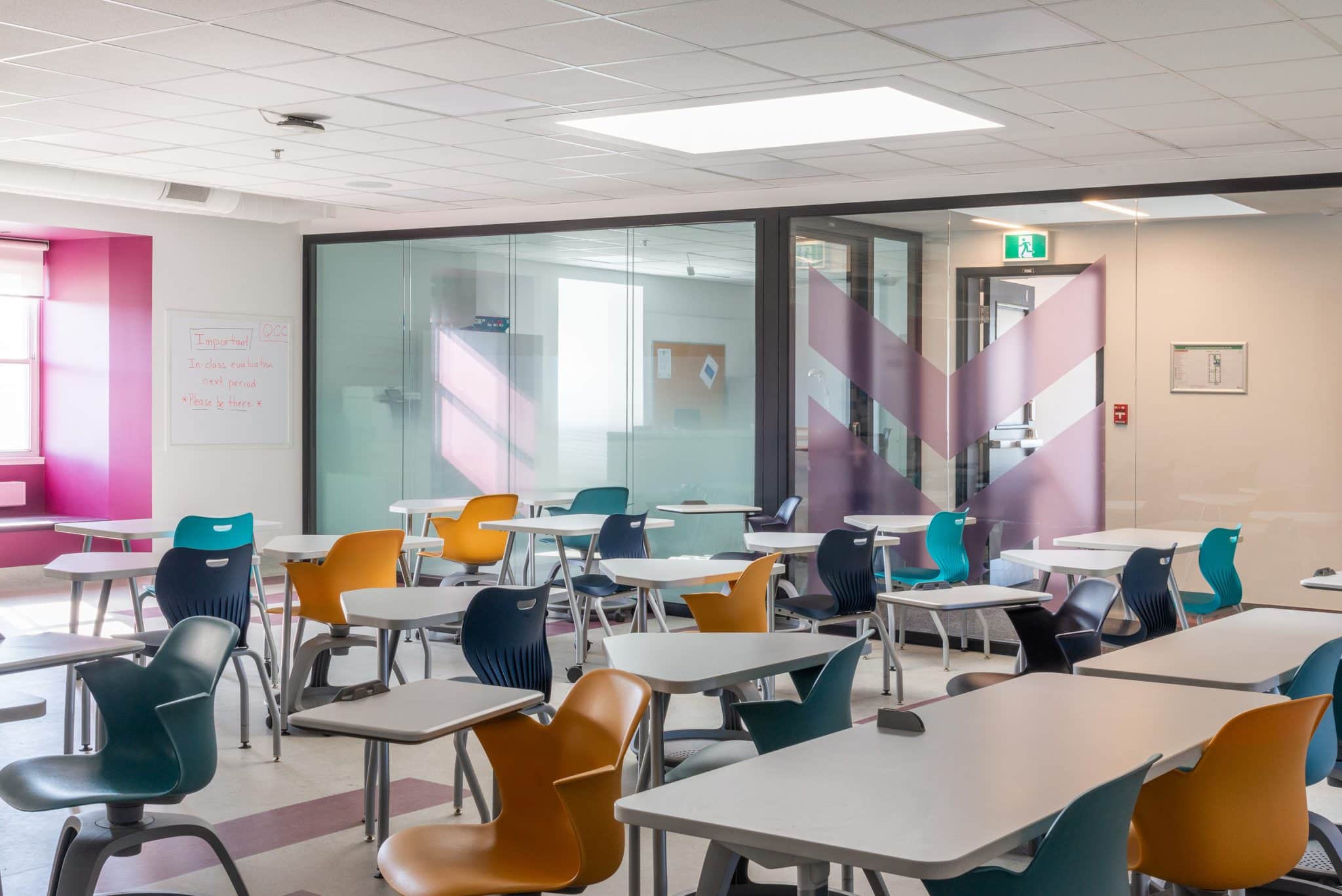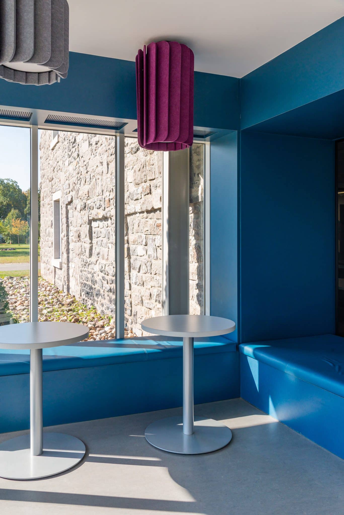 L’utilisation de cloisons vitrées, d’abord utilisées afin de moduler l’espace, faciliteront un éclairage naturel abondant qui pénétrera à travers les différents espaces. Ces cloisons auront par ailleurs l’avantage de pouvoir être utilisées comme surfaces inscriptibles. Certaines cloisons étant amovibles, la communauté pourra moduler à son gré les espaces en fonction des besoins, contribuant ainsi à favoriser la collaboration, la créativité ainsi que l’innovation.