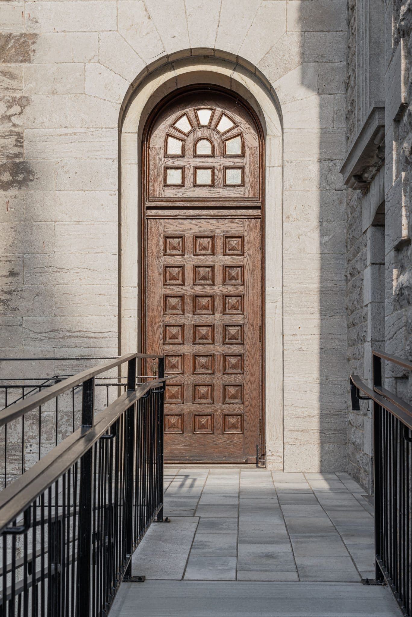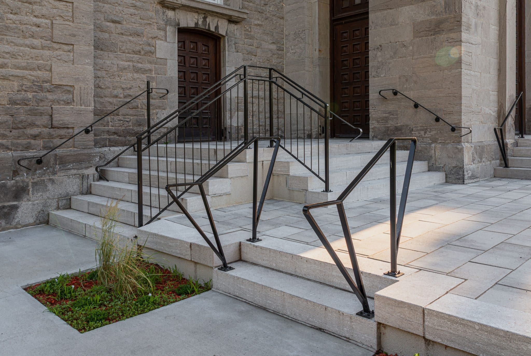 L’intervention a débuté par une évaluation exhaustive de l’état du parvis, incluant relevés, diagnostics de stabilité, analyse des matériaux existants et étude de drainage. L’équipe a mis de l’avant une stratégie de conservation centrée sur la réutilisation des matériaux originaux lorsque possible, en veillant à maintenir la lecture historique du site.